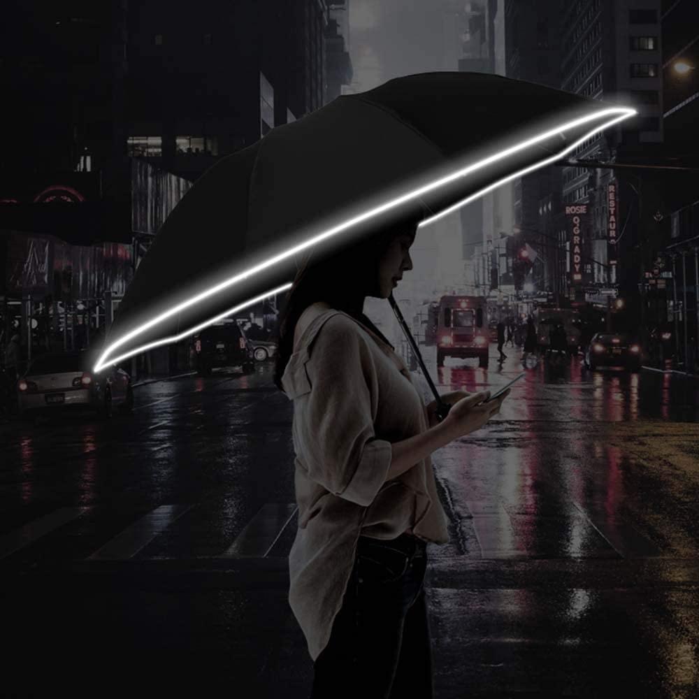 This umbrella is easy to open, the most important thing is that it is big enough. I like navy blue. Another reason I like this folding umbrella is that it has lights and a very unique design.