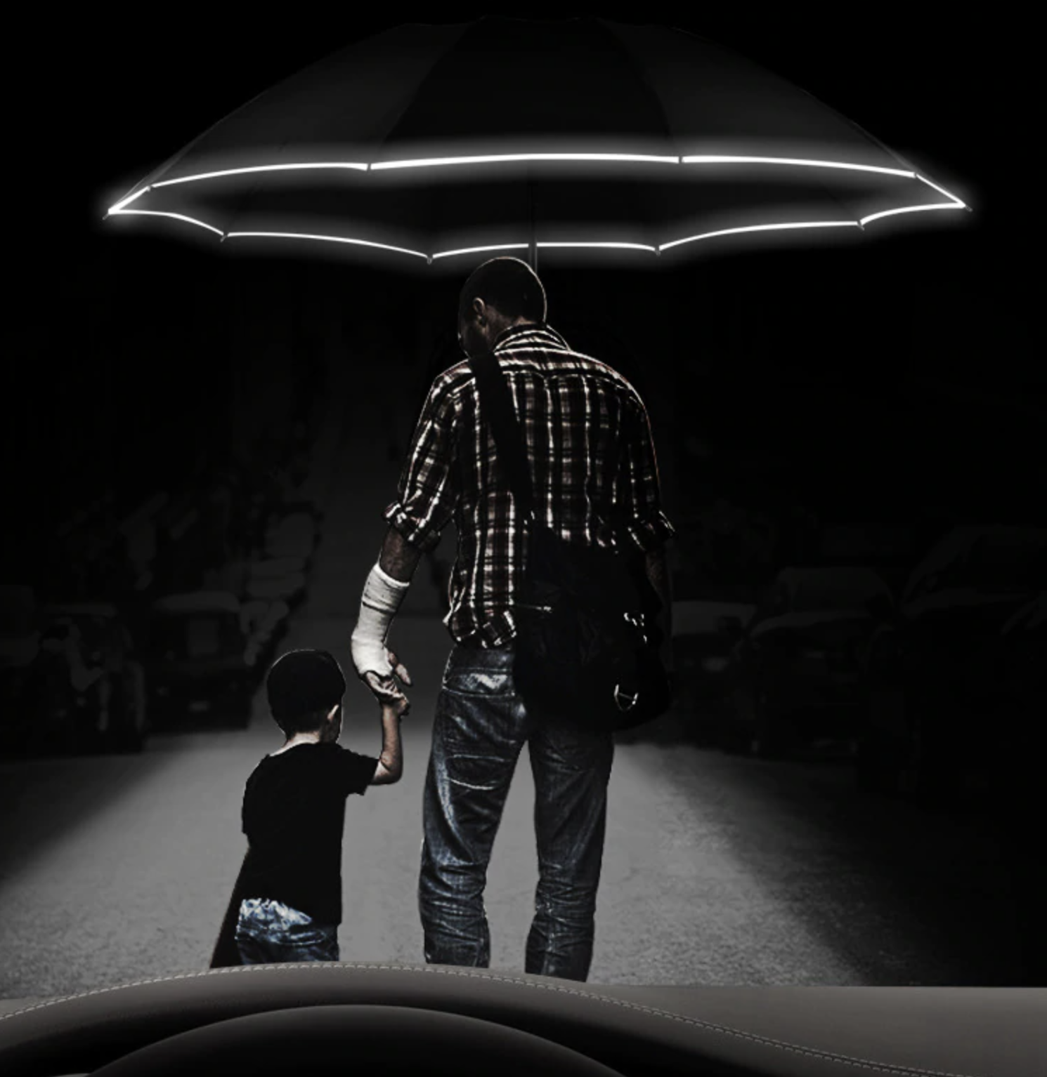 The light at the base of the handle is super bright and rotates so you can aim the light so you can see where you're walking when it is dark. Love that it has a reflective strip around the umbrella itself.